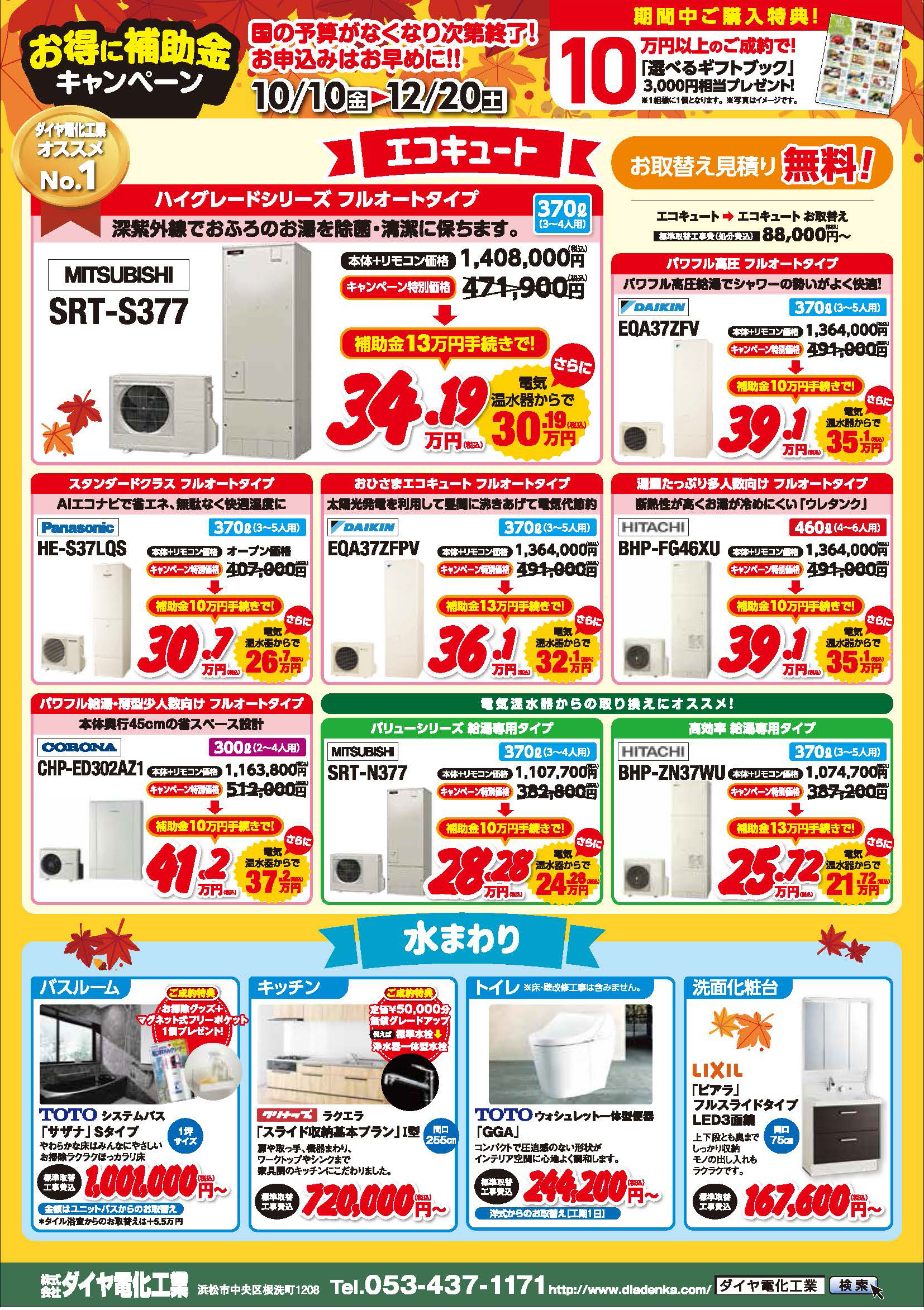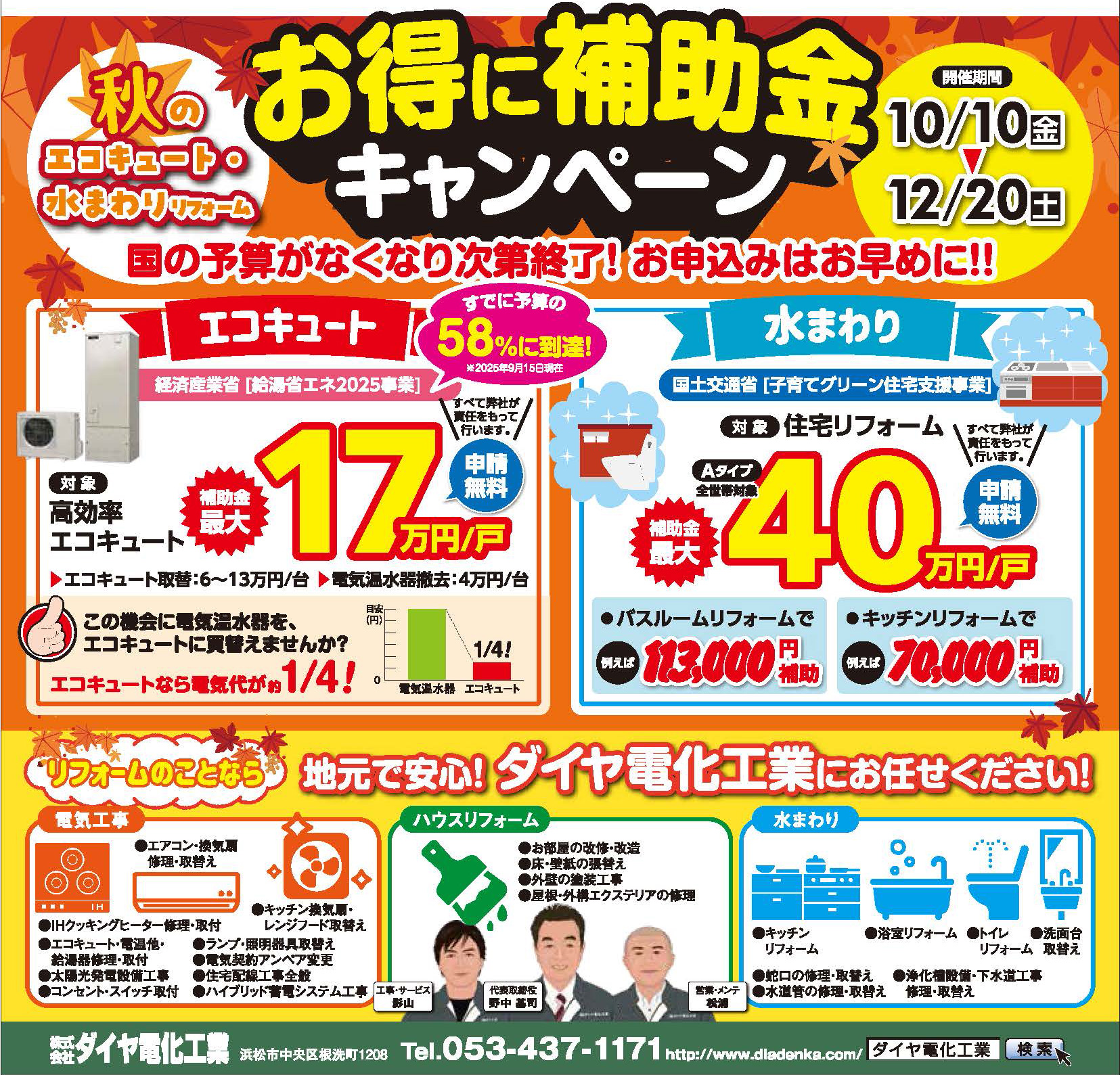 2025年9月23日 / 最終更新日 : 2025年9月23日 新海稔和 お知らせ お得に補助金キャンペーン開催! ■10月10日(金)~12月20日(土)、秋のエコキュート・水まわりリフォーム「お得に補助金キャンペーン」を開催いたします。