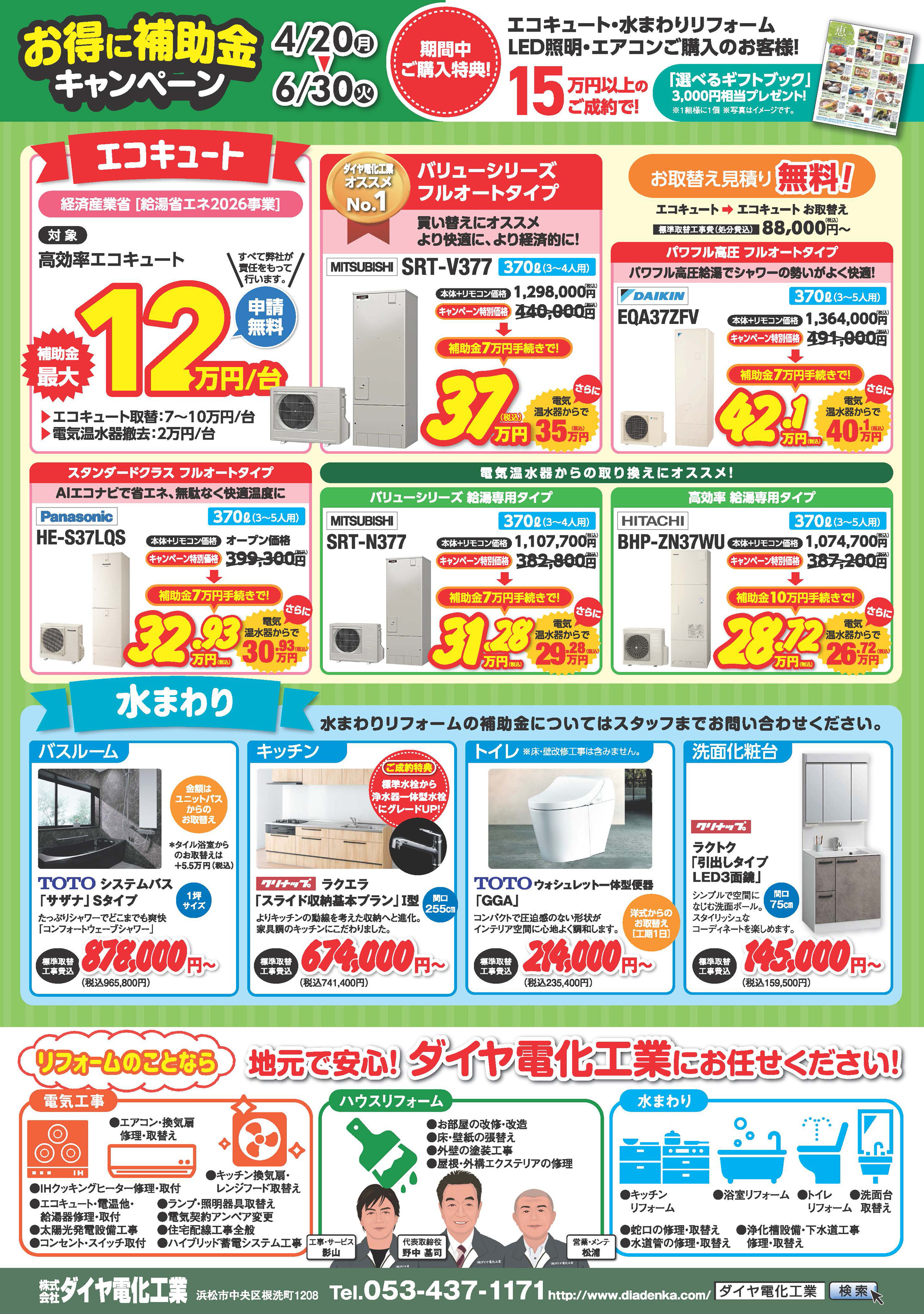 2026年4月1日 / 最終更新日 : 2026年4月1日 新海稔和 お知らせ 2026年「お得に補助金キャンペーン」開催! ●2026年4月20日(月)~6月30日(火):お得に補助金キャンペーン ●エコキュート、水まわりリフォーム、LED照明、エアコンご購入のお客様、期間中ご購入特典!